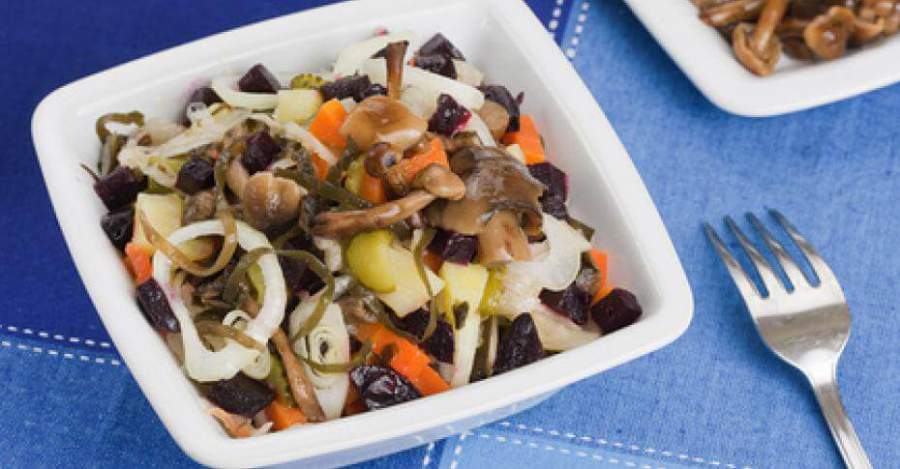 Винегрет с морской капустой и солеными опятами подойдет как для домашней трапезы, так и для праздничного стола. Эта закуска понравится даже тем едокам, которые не любят морскую капусту. Соленые опята и морская капуста в списке ингредиентов представлены дополнительно к основному набору продуктов. Вместо опят можно использовать в винегрете и любые другие грибы, соленые или маринованные.