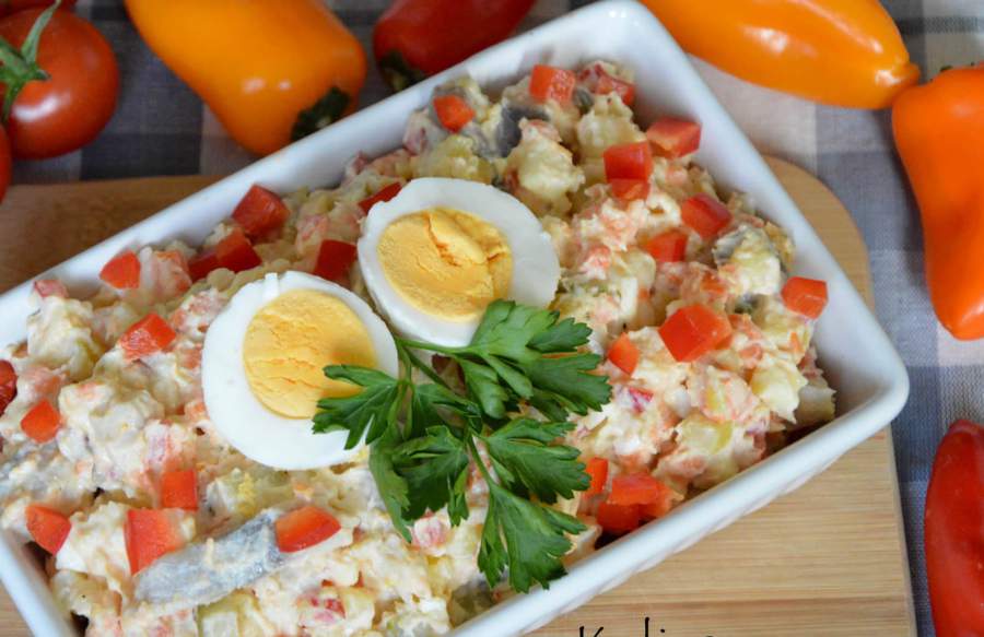8.Картофельный салат из сельди с овощами готов. Украсьте его вареным яйцом и подайте к столу как замечательную закуску.