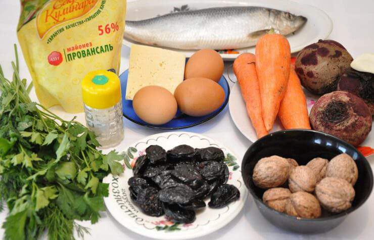 3. Грецкие орехи очистите от скорлупы, а зерна разделите на четвертинки. Чернослив без косточек замочите в кипятке минут на 15-20. Чеснок очистите от шелухи и пропустите через пресс.