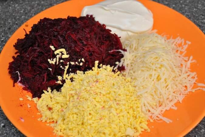 4. Приготовьте свекольную массу – добавьте к тертой свёкле 1 тертый или размятый вилкой яичный желток и немного майонеза.