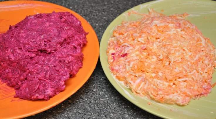 1. Морковь и свёклу отварите до готовности в кожуре, слейте отвар, Когда овощи остынут, очистите их от кожицы и по отдельности натрите на терке.