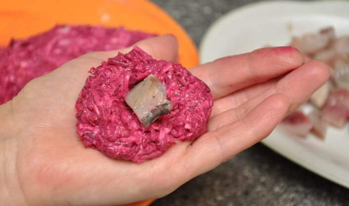 7. Свекольную массу тоже скатайте в виде шариков, запрятав внутрь по кусочку филе сельди. Оригинальные фиолетовые «игрушки» будут иметь вкус знаменитой селедки под шубой.