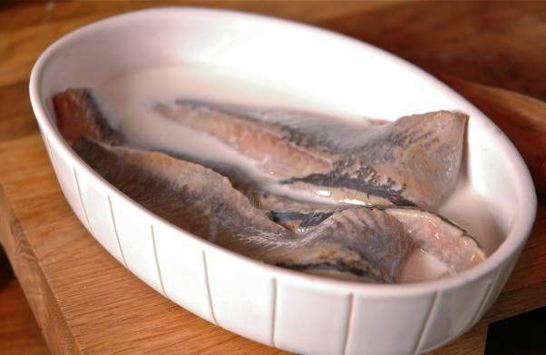 Хороший результат будет, если вы подержите селедку некоторое время в молоке после нескольких часов вымачивания в воде. Если сельдь не слишком соленая, то вымачивать в молоке можно и без предварительных длительных водных процедур. На 1 кг сельди возьмите 1 стакан молока (250 мл) и вымачивайте около 3 часов.