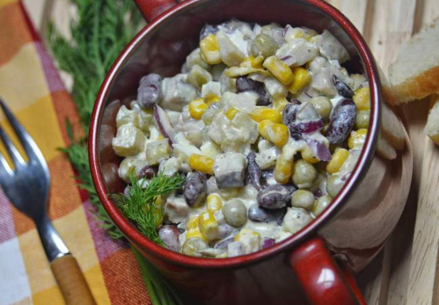 2. Яйца отварите вкрутую, залейте холодной водой и оставьте остывать. Кукурузу, фасоль и горошек откиньте на дуршлаг, чтобы стекла жидкость.