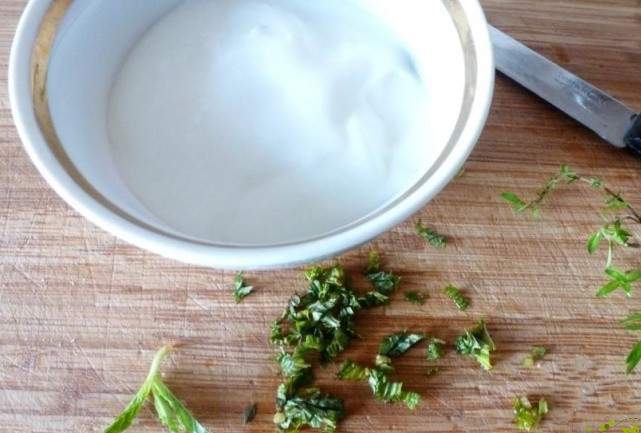 Салат в яблоках приобретет оригинальную вкусовую изюминку, если вы заправите его не обычным, а пряным йогуртом с добавлением ароматных трав. Приготовить такой йогурт просто. Возьмите 3 ст. ложки обычного густого йогурта, добавьте ½ ч. ложки жидкого меда, по ½ ч. ложки мелко рубленой мяты и чабреца. Хорошо перемешайте, можете немножко посолить.