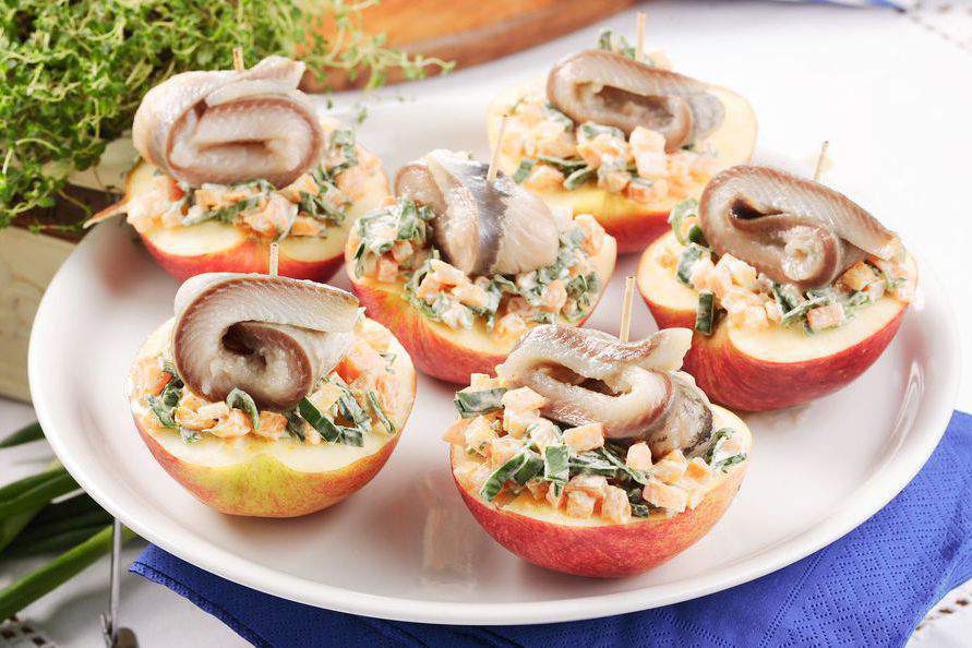 6. Готовый селедочный салат в половинках яблок уложите на блюдо и подайте к столу.