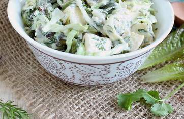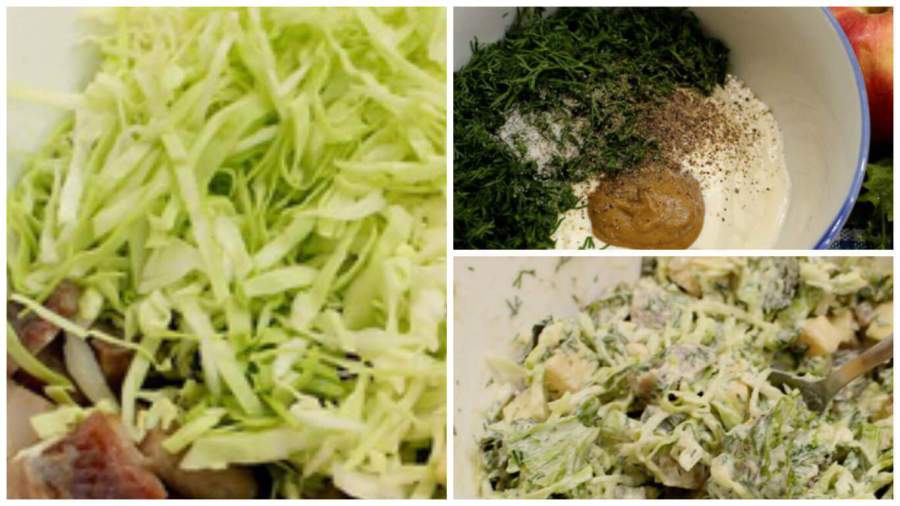 3. Промойте и осушите капусту, нашинкуйте ее мелко. Смешайте в большой миске капусту с селедкой и яблоком.