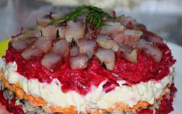 6. На плоское блюдо выкладывайте подготовленные ингредиенты слоями. Порядок слоев следующий: половина свёклы, грибы, морковь, яйца, остатки свёклы. Сверху аккуратно разложите кусочки селедки.