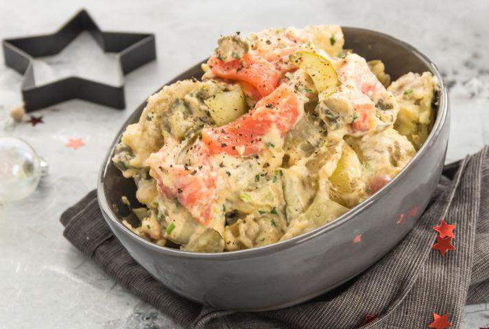 5. Смешайте в салатном блюде картофель с каперсами, огурцами и лососем. Приправьте салат по желанию солью и перцем и хорошо перемешайте.