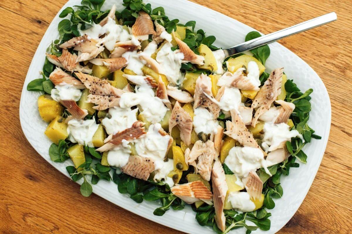 7.Невеликі шматочки копченого лосося відокремте від кісточок і розкидайте поміж картоплею. Заправте салат йогуртовою заправкою.