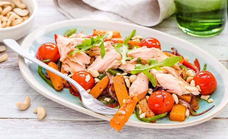 6. Переложите овощи в салатное блюдо, добавьте к ним кусочки рыбы и полейте заправкой. По желанию можете украсить салат орешками. Подождите 15 минут пока салат из копченой горбуши с тыквой настоится и подавайте к столу.