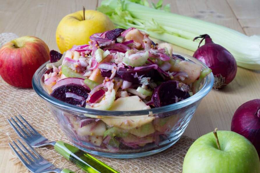 7.Салат из скумбрии со свёклой и яблоками готовится просто, но вкус имеет замечательный. Он идеально подходит как для домашней будничной трапезы, так и для праздничного стола. В этом наборе продуктов лучше использовать кисло-сладкие сорта яблок.