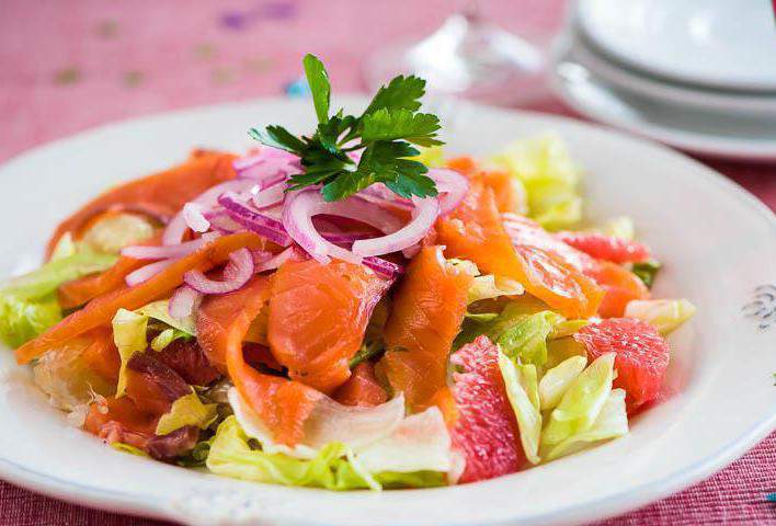 6. Затем приготовьте заправку для салата с копченной семгой и грейпфрутом. Смешайте в отошедший сок грейпфрута, имбирь, оливковое масло и острый перец, посолите по вкусу.