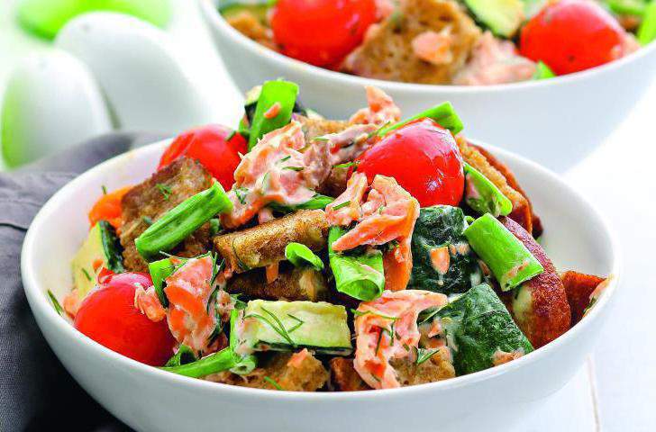 6. Разделите копченую форель на небольшие кусочки. Выложите запеченные овощи на салатное блюдо, добавьте копченную форель, ржаные гренки и нарезанный крупными кусочками зеленый лук.