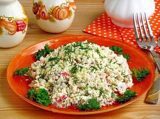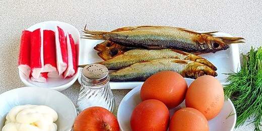 Салат с копченой рыбой, крабовыми палочками и яйцами
