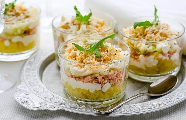 Риба і картопля відмінно поєднуються у різних стравах – супах, закусках та салатах. Супи зазвичай готуються для буденної домашньої трапези й пікніка. А закуски та салати відмінно урізноманітнюють святковий стіл. Пропонуємо до вашої уваги простий рецепт шарового салату з копченої горбуші з картоплею.
