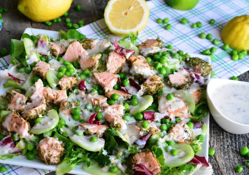 4. Салат микс вымойте, отряхните от влаги и, слегка порвав листья руками, уложите на блюдо. На салатную зелень выложите зеленый горошек и ломтики огурцов, сверху расположите кубики запеченного лосося и обильно полейте все соусом.