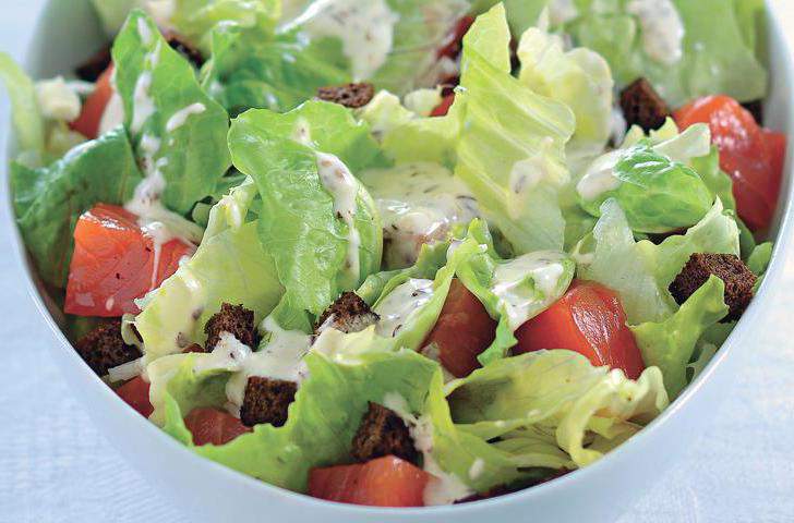 4. Высыпьте все ингредиенты для салата в салатницу, полейте йогуртовой заправкой и хорошо перемешайте. Салат с малосольным лососем и сухариками готов к употреблению.