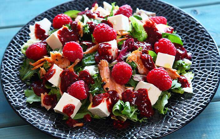 Готовим салат с запеченным лососем, малиной и фетой