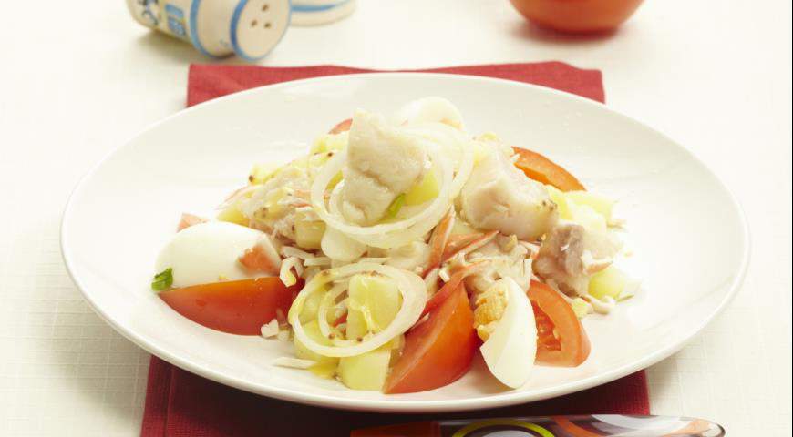 9. Готовый бретонский салат с треской полейте соусом и посыпьте зеленым луком.