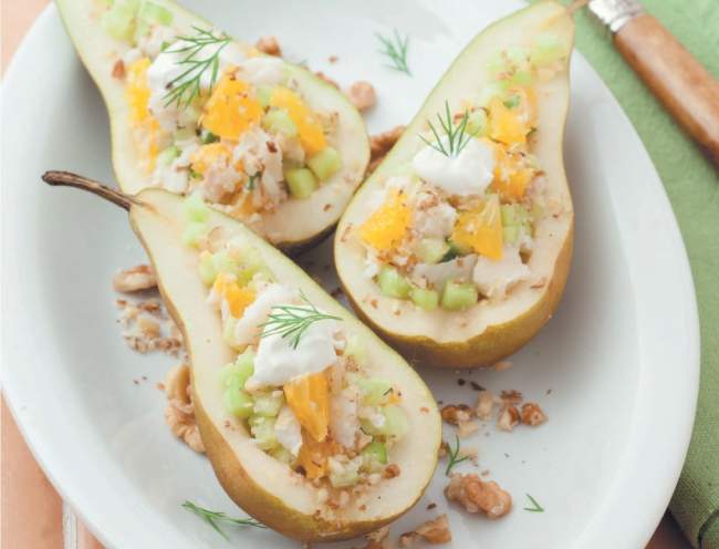7. Полученной массой заполните половинки груш и посыпьте рублеными грецкими орехами.