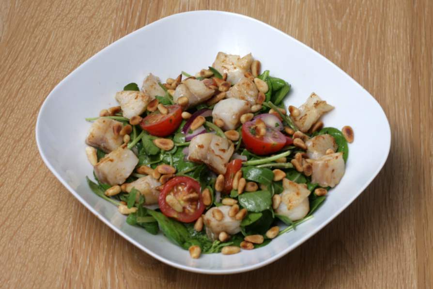 8.Выложите жареную треску на бумажное полотенце, чтобы удалить излишки жира, а затем разложите в миске на поверхности приготовленного салата. Салат с треской, овощами и зеленью готов. Его можно подавать к столу в тёплом и в холодном виде.