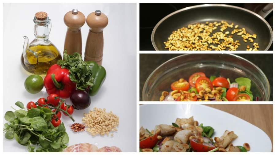 5.Соедините в глубокой миске салатную зелень, измельченные овощи, поджаренный арахис. Полейте заправкой и перемешайте. Теперь приступайте к жарке рыбы.