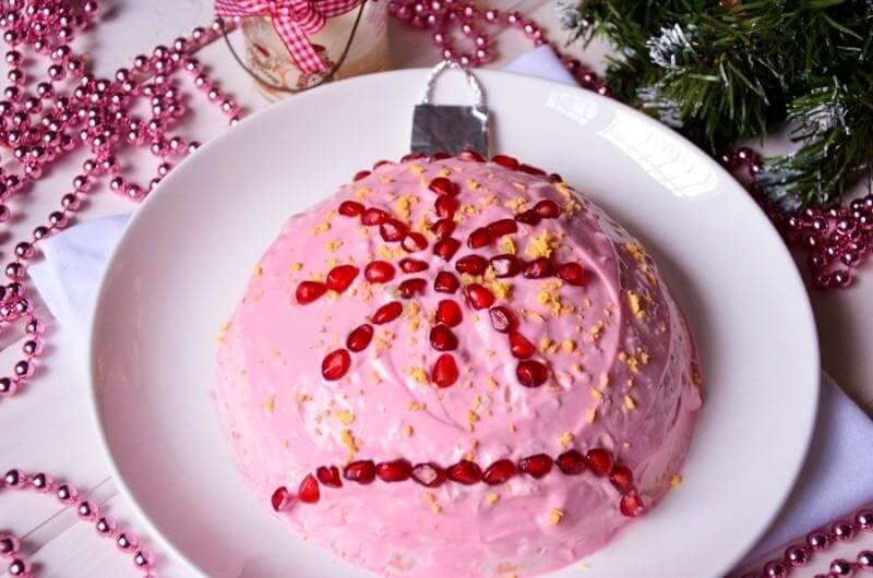 7. Украсьте салат узорами из зерен граната, посыпьте раскрошенным яичным желтком. При желании можете из фольги и тесемки изготовить петельку с держателем, чтобы ваш салат приобрел окончательное сходство с новогодним шариком.