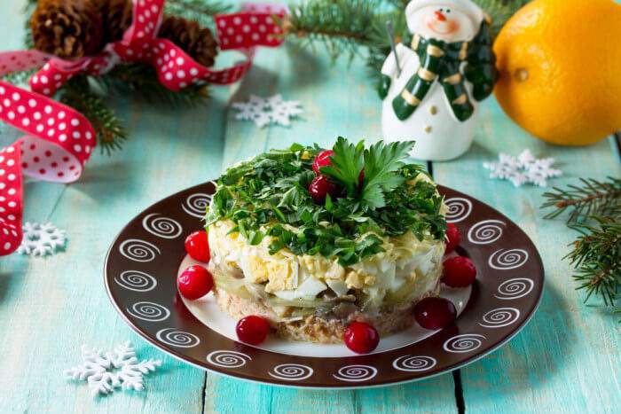 7.Уложенный салат с кольцом уберите в холодильник на 1-2 часа. Затем осторожно снимите форму-кольцо, украсьте салат листьями петрушки и свежими ягодами клюквы.