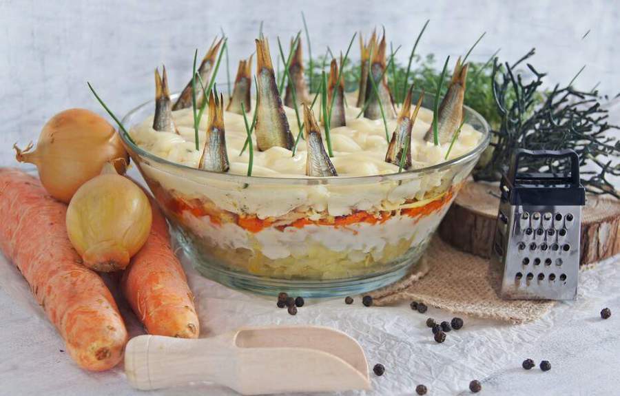 5. В глубокий прозрачный салатник уложите последовательными слоями – картофель, на него лук. Приправьте солью и перцем, смажьте майонезом. На майонез уложите морковь, размятые шпроты, тертый сыр. Приправьте солью и перцем и снова сверху обильно смажьте майонезом.