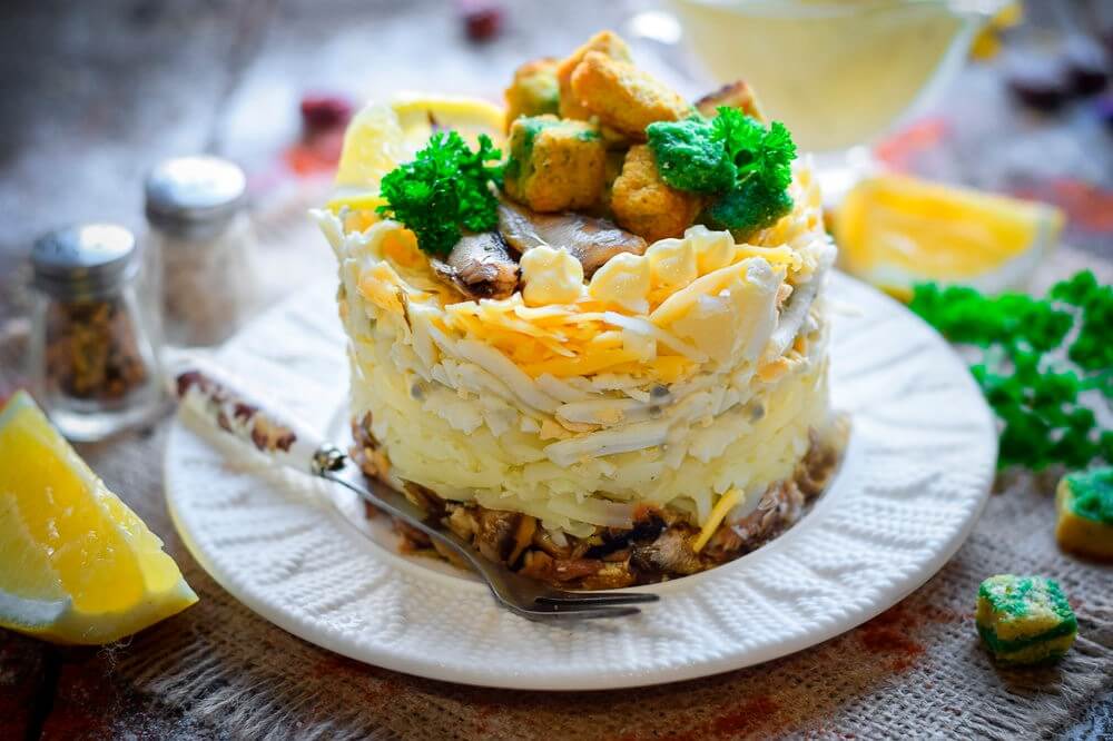 Шпротный салат с сухариками готовится быстро и просто, но способен изумить аппетитным вкусом слоеной закуски и красивой подачей. Укладку слоев с помощью специальной салатной формы можно предусмотреть на общем блюде или в варианте порционной подачи.