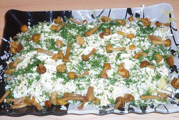 10. Экземпляры покрупнее нарежьте ломтиками, маленькие грибки оставьте целыми. Салат посыпьте сверху подготовленными опятами и поставьте в холодильник на 40-50 минут для лучшего пропитывания слоев.