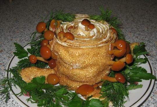 7. Обрезки блинов используйте для изготовления корней пенька с трех сторон, скрутив их в рулеты. «Рассадите» на пенек грибки, украсьте блюдо у основания зеленью. При помощи майонеза можете нанести на срез пенька «древесные кольца. Салат «Пенек» с опятами и ветчиной готов к подаче на стол.