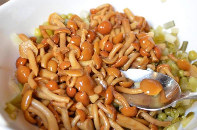Маринованные опята лучше, чтобы были очень маленькими. Но если у вас в банке заготовлены крупные грибы, порежьте их на кусочки.