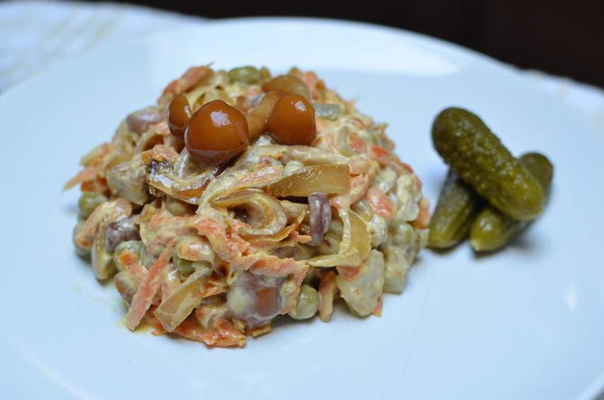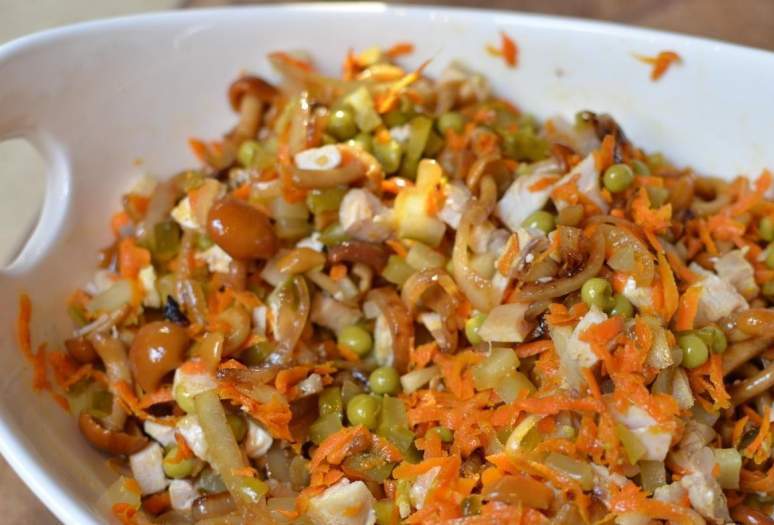 5. Промытые опята и горошек, нарезанные огурцы, измельченный и обжаренный лук с морковью добавьте в салатник к нарезанной курятине.