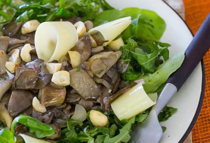 8. Посыпьте теплый салат с вешенками, зеленью и сыром орехами и кусочками сыра и подавайте немедленно.