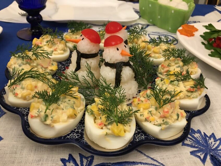 Успех салата из крабовых палочек в белковых лодочках предопределяет простота приготовления и удачное вкусовое сочетание доступных ингредиентов. Интересная подача в лодочках из яичных желтков на блюде с забавными съедобными снеговиками превратит простой салат в эффектное изысканное блюдо.