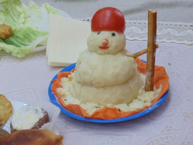 Установите снеговиков на блюдо, слегка приплюснув нижние два шарика. Приделайте носы из моркови, глаза из черного кунжута, шапки из ломтиков помидоров или перца, шарфы из пластины водорослей для роллов (или других подручных продуктов). Подключите свою фантазию, и ваши снеговики получатся на славу.