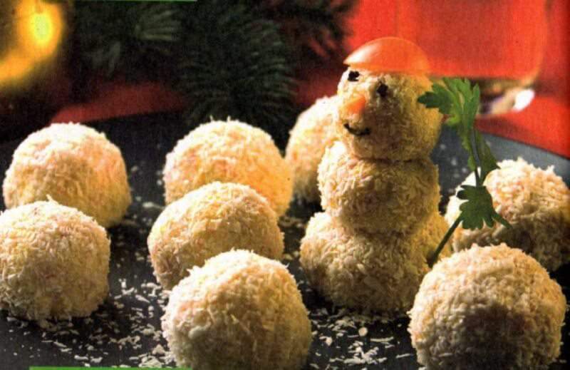 4. Из приготовленной массы салата сформируйте шарики, обваляйте их в кокосовой стружке. На большое плоское блюдо уложите шарики-снежки. Между снежками сформируйте 2-3 снеговика, собрав их из трех шариков разного размера.
