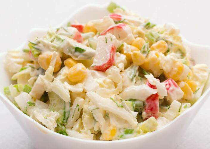 Если вы не любите салаты с майонезом, салат с пекинской капустой и крабовыми палочками можно заправить смесью оливкового масла с лимонным соком, получится не менее вкусно.