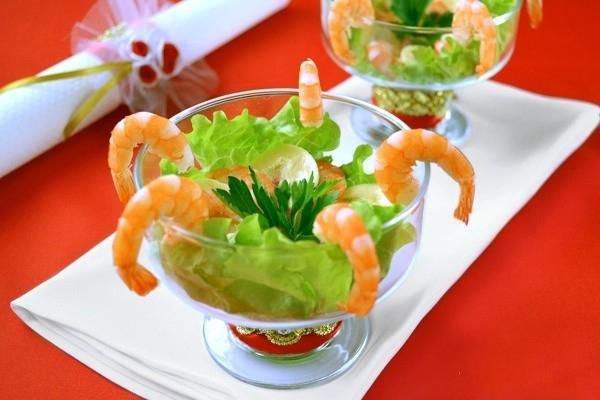 5. Салат с креветками «Тенерифе» разложите в сервировочные креманки или просторные бокалы на ножках, украсьте по вкусу и подайте к столу.