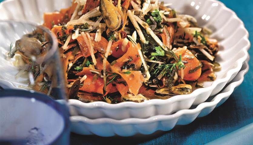 5. В большой салатник сложите морскую капусту, нарезанные белые коренья, маринованные полоски моркови, мидии, тертый сыр. Вымойте, обсушите и мелко нарежьте три вида зелени и добавьте в салатник. Перемешайте все ингредиенты.