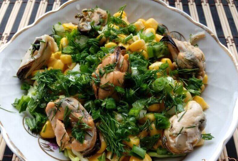 5.Салат с маринованными мидиями, молодой капустой и перепелиными яйцами готов. Подавайте его к столу сразу, пока капуста не истекла соком, потеряв свои хрустящие свойства.