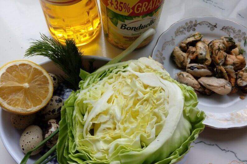 Готовим салат с маринованными мидиями, молодой капустой и перепелиными яйцами