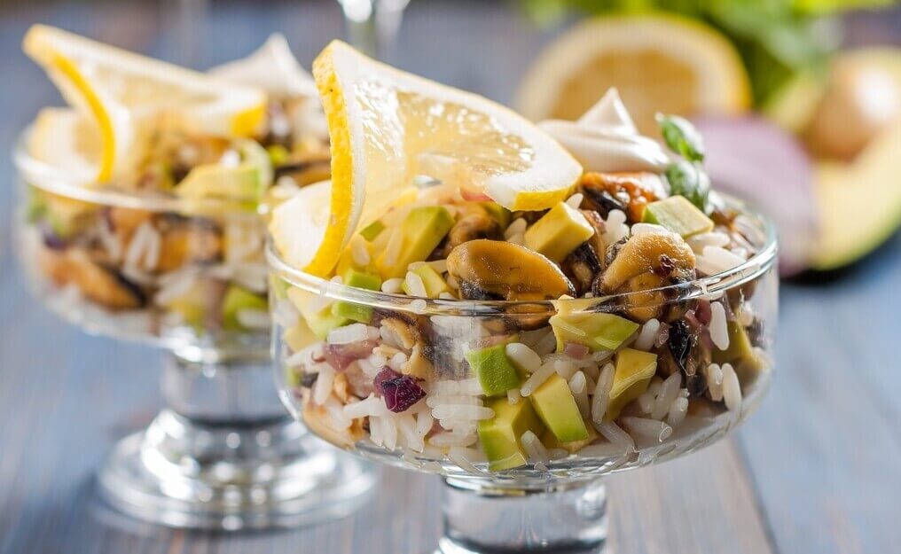 Предлагаем вашему вниманию рецепт салата с мидиями, рисом и авокадо, в котором содержится кладезь витаминов и других, полезных для организма веществ. Такой красиво поданный салат понравится вашим гостям и утолит их голод. Благодаря подаче в порционных креманках, салат станет украшением любого стола.