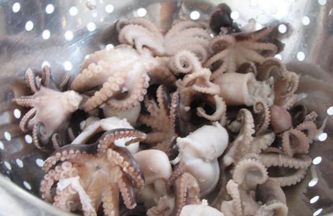 3. Выньте мини-осьмигногов из банки и нарежьте на крупные куски, не промывая от маринада.
