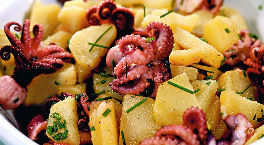 4. Зеленый лук тщательно вымойте, удаляя поврежденные и подсохшие перья, и нарежьте кусочками длиной около 1 см. В салатник с картофелем добавьте измельченных осьминогов с луком и перемешайте. При желании можете влить в салат несколько ложек маринада от осьминогов.
