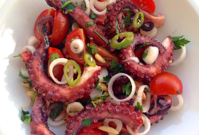 Выбор вин к салату из осьминога может быть самым разнообразным – от красного Каберне Совиньон до ароматного Видаль Блана. Можно предложить более крепкий морской напиток ром, который замечательно сочетается с морепродуктами.