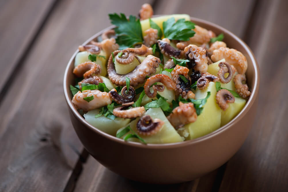 Якщо ви любите морепродукти чи вирішили вразити гостей оригінальною вишуканою стравою, можете сміливо зупинити свій вибір на восьминогові, який на смак схожий на кальмара, та набагато ніжніший і м'якший, якщо приготовлений правильно. Пропонуємо до вашої уваги рецепт салату із восьминога з картоплею.