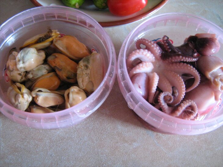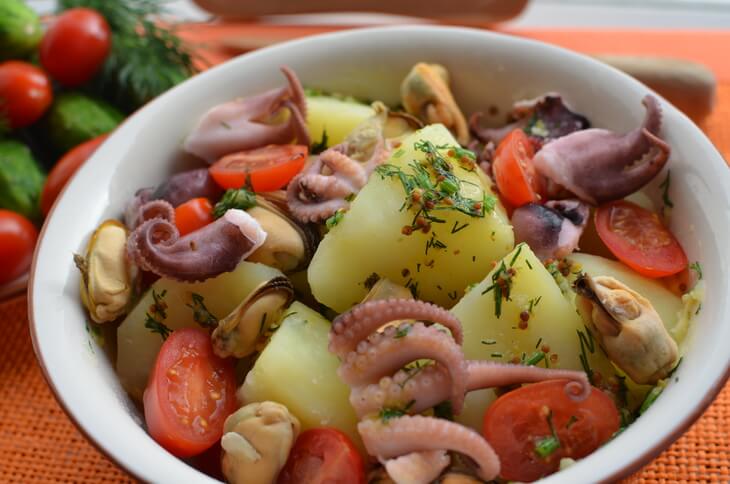 Если вы живете возле моря, проблем с ингредиентами для салата не будет. В противном случае выручат маринованные морепродукты, благодаря которым вам не придется морочиться с варкой. Открыв баночки, вы получите морепродукты, уже пригодные для добавления в салат. Тёплый картофельный салат с осьминогами и мидиями будет готов за несколько минут, если не учитывать время на варку картофеля.